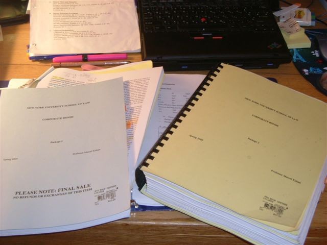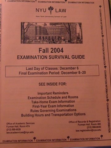 LLM一學期中最恐怖的時刻就是Finals了...要記憶一大堆英文case,讀一大堆書,更可怕的是要跟美國JD學生一起在課堂上考試......NYU的考試分成兩種,一種是in class考試,課堂上考,另外一種是takehome,在家裡考完,但必須在指定的時間uploade你的答案. NYU算是電腦系統相當進步的學校了,考試可以用電腦作答,但是你必須要用學校指定的軟體....ExamSoft!你必須在考前的四十八小時下載考試的答案卷,然後在考試教室中把電腦先打開,輸入監考人員寫在黑板的password,他們會發題目的hardcopy,等到他們說Begin!這時候你就在系統中Click Begin,然後就開始作答.時間一到,系統會自動鎖住,不讓你繼續做答,然後你必須把答案上傳.聽起來好像很容易是吧? 所以這個軟體才叫做ExamSoft.但是考試內容可是一點都不Soft,依據某位教授開玩笑的說法, 應該是ExamHard! 的確,這學期的公司法授課教授是來自Yale的超天才女教授,考前她很好心的提供今年春天的考古題,題目大概有六頁,然而今年她給我們的題目居然有十頁,而且是Single Space!光第一題就七頁,作答時間只有四小時, 其中還包括一題立法政策題!Mission Impossible, right?大家考完臉都綠了,腦袋幾乎要當機了.... 好吧,那takehome是否會好點呢? takehome大部分大概是24小時或48小時,唯一的好處只是沒有in class考試的time pressure, 然而書還是要先唸一遍,要有些概念,否則就算是48小時也不夠.takehome雖然沒有時間壓力,但相對的教授也會期待你的格式內容要比較完整,所以通常的結果就是你可能要坐在書桌前至少十幾個小時寫答案...組織你的答案.目前我聽到最可怕的takehome考試就是某位WTO大師的課,24小時,有三大題,第三題題目就有六十四頁.......真是太驚人了......光題目看完也要不少的時間.......目前有可憐的同學正在奮戰中,Good Luck To Him!